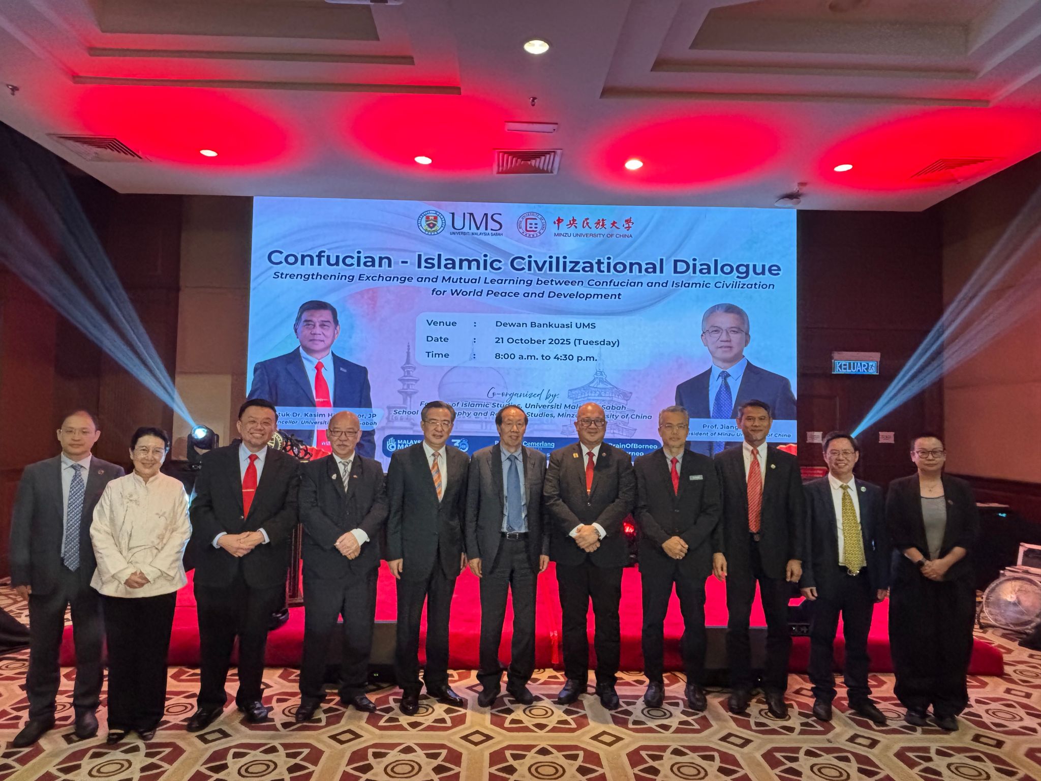 新闻网讯  10月21日,由中央民族大学、马来西亚沙巴大学及中国驻哥打基纳巴卢总领馆共同主办的“儒伊文明对话会”在马来西亚沙巴大学举行。中国驻哥打基纳巴卢总领事朱兴龙,中国文物保护基金会理事长刘玉珠,沙巴大学常务副校长卡欣代表萨菲里,沙巴州旅游、文化及环境部长刘静芝,沙巴州前首席部长杨德利等出席并致辞。中央民族大学党委副书记、校长强世功通过视频方式参会,并发表了题为《加强文明互鉴 以东方智慧共促和平发展》的主旨演讲。