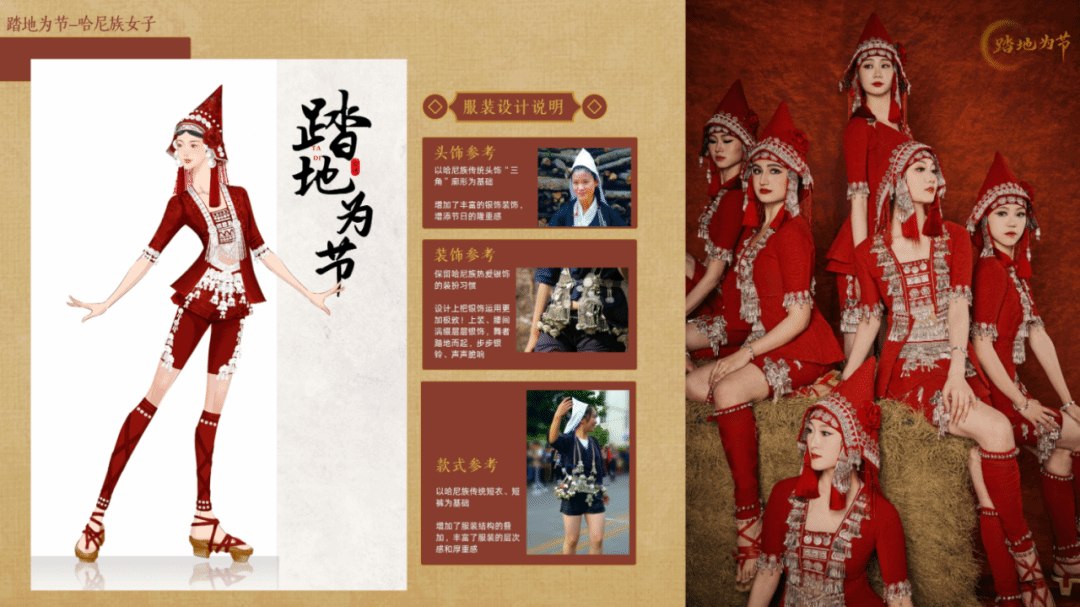 这种当代与传统、艺术创新与文化遗产之间的对话,不仅体现在《踏地为节》的舞蹈创作中,也显示在服装设计里。节目服装设计师以傈僳族与哈尼族古老的踏歌传统为基础,在有效吸收民族服饰文化的基础上,进一步结合春节的节日气质和春晚舞台进行创新改良。