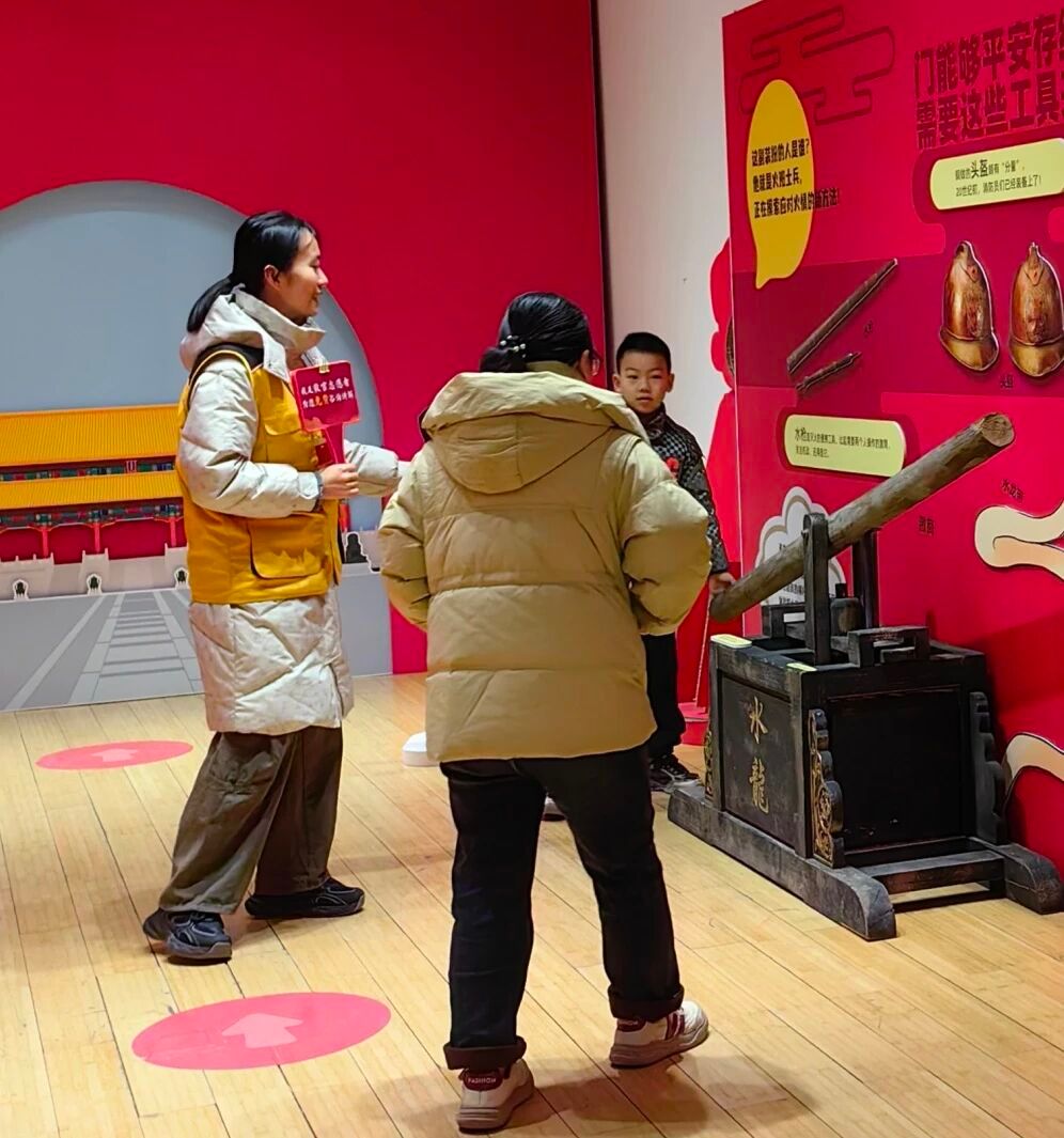 在学雷锋纪念日主题活动中,学生志愿者走出固定展厅、融入参观动线,把在展厅中积累的文物知识、讲解经验与沟通技巧,转化为面向广大观众的轻量化文化宣讲,让文物知识、建筑智慧、历史信息以更鲜活、更亲民的方式传递给大众。宣讲结束后还有互动问答环节,志愿者们手持特制题板,根据宣讲内容提出问题,答对的观众可获得精美纪念贴纸,现场参与热情十分高涨。