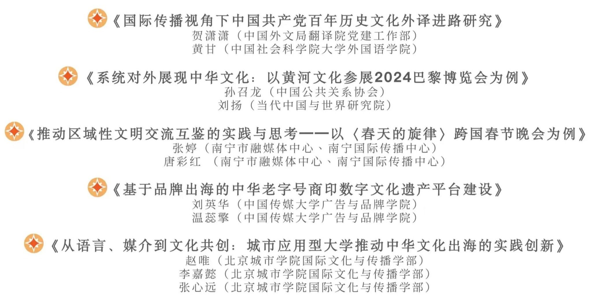 在优秀案例分享环节,中国外文局主任编辑贺潇潇以《中国共产党历史文化国际传播研究——基于外译实践的国际传播路径探索》为题,系统梳理了中国共产党形象在一百多年来发展进程中的国际传播路径方法。中国公共关系协会会长助理孙召龙以《黄河文化出海记:在巴黎与你相遇》为题,分析了中国公共关系协会以2024年巴黎博览会为平台,联合主办的“九曲黄河 一脉相承”黄河文化专题展示活动。中国传媒大学博士研究生温蕊擎以《基于品牌出海的中华老字号商印数字文化遗产平台建设》为题,分享了中华老字号商印的数字文化遗产平台建设,及其作为中华文化符号的叙事转译与品牌出海路径。北京城市学院专任教师赵唯以《从语言、媒介到文化共创:城市应用型大学推动中华文化出海的实践创新》为题,以北京城市学院国际文化与传播学部的“中外青年工作坊”和海外孔子学院的“文化课程与数字共创”为例,分享了地方应用型高校如何利用实践场景与在地文化资源参与中华文化“出海”的经验。