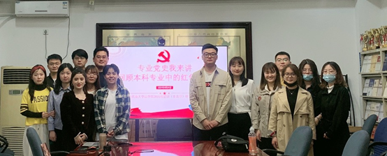 支部16名党员在本科阶段来自13个不同类别专业。支部书记的带领下,同学们通过研究不同本科专业学科特点,挖掘与本科专业相关的红色人物和红色故事与大家分享。任劭恒的本科专业为工程管理,他分享了青年鲁班李瑞环的故事;常悦的本科专业是工商管理,她分享了民族资本家纪振刚支持陈毅江南抗战的往事;王梦垚的本科专业是日语,她分享了台儿庄大捷的谍报英雄夏文运的故事;冯文君的本科专业是英语,她分享了毛泽东笑译纸老虎的故事;赵英英的本科专业是英语,她介绍了红色翻译家瞿秋白;林倩的本科专业是刑事科学技术,她分享了新中国第一代刑侦专家乌国庆的故事;代畅的本科专业是服装设计与工程,她分享了实业大王荣得生的故事;杨飞的本科专业是思想政治教育,他分享了习近平总书记扶贫的故事;张蕾的本科专业是新闻学,她分享的是油画《送别》中的故事。